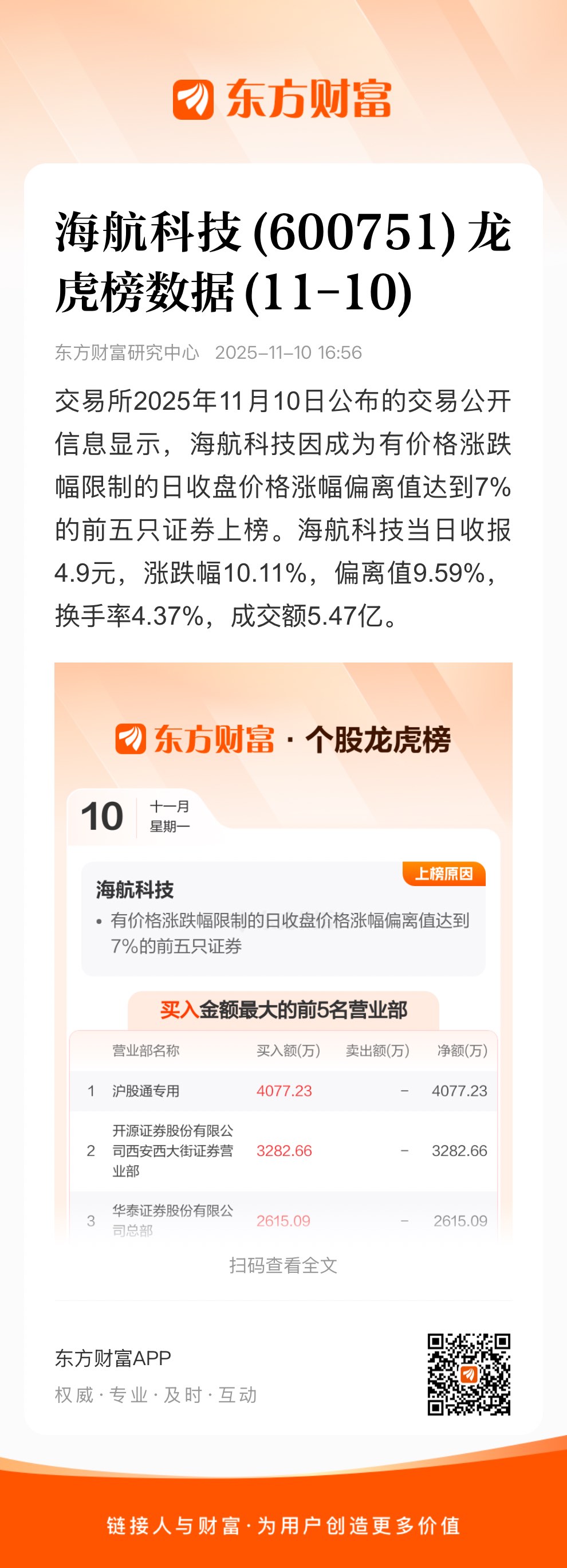 交易所2025年11月10日公布的交易公开信息显示,海航科技因成为有价格涨跌幅限制的日收盘价格涨幅偏离值达到7%的前五只证券上榜。海航科技当日收报4.9元,涨跌幅10.11%,偏离值9.59%,换手率4.37%,成交额5.47亿。