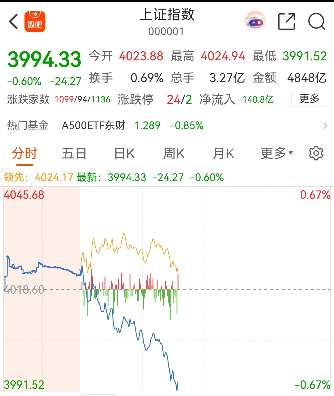 沪指盘中目前已经下探至3991.52点,出现了些许非理性波动,大家不要怕!
