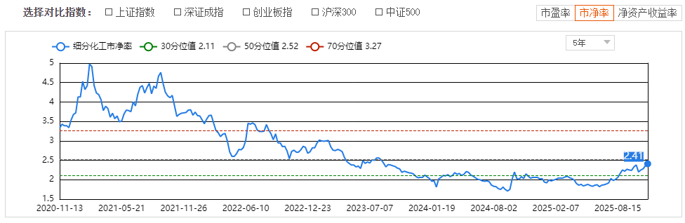 从估值维度观察,当前化工板块市净率为2.41倍,处于近5年45%分位,显著低于沪深300指数的估值水平。这种估值洼地与政策驱动的基本面改善形成显著剪刀差,为ETF投资提供了安全边际。