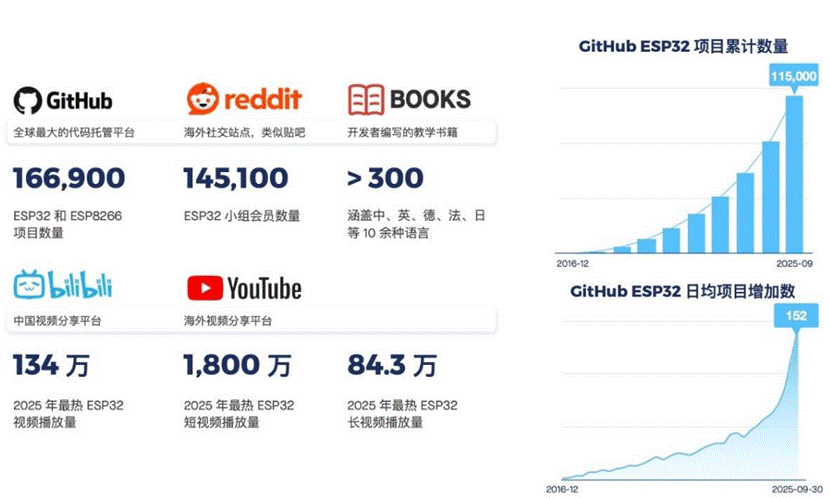 其打造的ESP-IDF软件开发平台,经过多年积累,拥有庞大且活跃的全球开发者社区。截至2025年三季度,GitHub上ESP32项目数增至11.5万个(半年增长2.4万个),日均新增项目达152个。活跃的开发者社群不仅反哺产品迭代,这种强大的用户粘性,使得下游客户的转换成本极高。一旦习惯了乐鑫的开发环境,就很难迁移到其他平台。