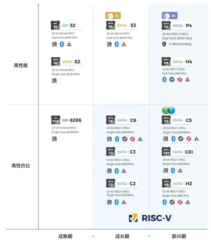 从ESP8266到性能更强、集成了蓝牙功能的ESP32系列,再到如今支持Wi-Fi6、Thread和Matter协议的ESP32-C6,以及面向高性能边缘计算的ESP32-P4。