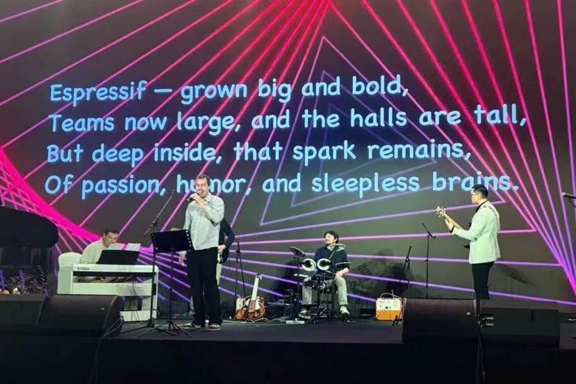 乐鑫年会上的工程师乐队,歌词大意:团队日益庞大,大楼高耸,但内心深处,依然充满激情、荣耀与不眠的大脑。