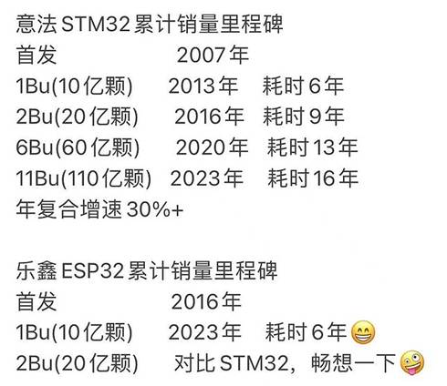 网上有张图对比了乐鑫和意法STM32的销量里程碑,目前乐鑫的物联网芯片累计出货量已超过15亿颗,毛利率维持45%+,正在向20亿颗的目标进军,拭目以待。