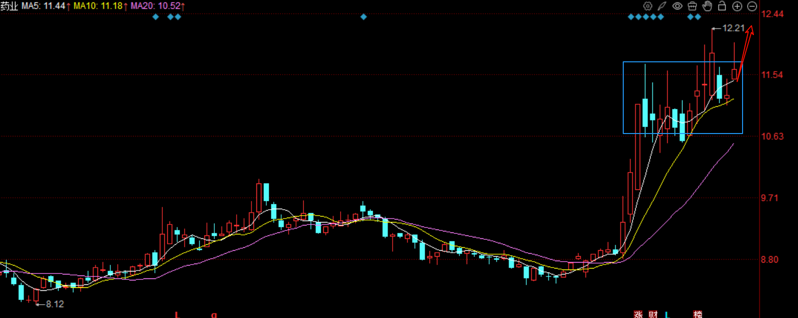 最近的市场,从最开始的科技股,到后续的电网,锂电池新能源为主线,到昨天的大消费,主线逐步切换,医药也是属于消费的分支,后续这个板块有望走强,且昨天盘后消息,12月或将出现我帼流感高峰,而且最近流感已经处于上升阶段,所以最近医药板块有望启动,标的上,特一药业旗下止咳宝是专门针对流感症状,有止咳退热等功效,此外还有布洛芬,蒲地蓝等配套用药。走势上,特一药业22号启动之后,一直维持在11附近横盘,量能和股价都非常活跃,几乎每天都有拉升动作,说明住力还在里面吸筹,等到洗盘完成之后,预计会有一波突破走势,最近的压力位是在12附近,只要能突破站稳,就能打开空间,开启上行模式。