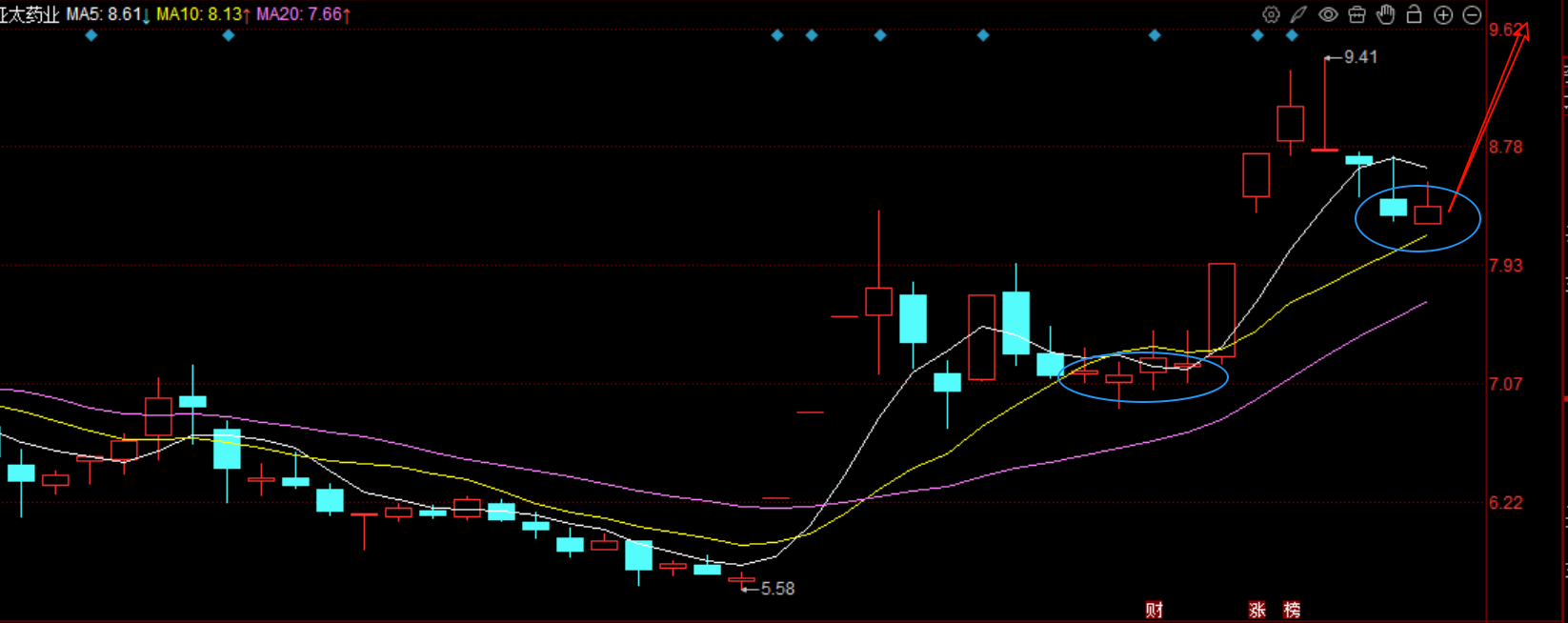除了特一之外,最近非常强势的还有亚太药业,公司是做创新药,化学制剂的研发为主,旗下抗生素药物也可以用在流感治疗上,同时最近亚太药业的股权转让,实控人发生了变更,新实控人不但以45%的高溢价受让公司股权,这说明看好公司的价值,而且新实控人还是药兜科技的创始人,旗下有医药电商萍台,对于后续公司的渠道有很大的益处,所以最近亚太药业也是持续大涨了好几波,最近经过几天的回调,再次回踩十日线的位置,上一波股价就是回踩十日线后又开始起涨,这次回踩叠加流感利好,后续还有进一步上涨的预期,策略上,就在十日线附近吸筹就可以,只要医药板块走强,亚太就会涨停,亚太的每一波的空间在20%左右,还是很值得博弈的。