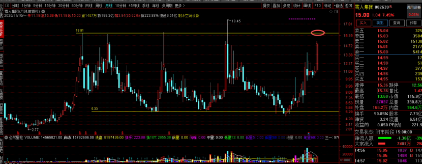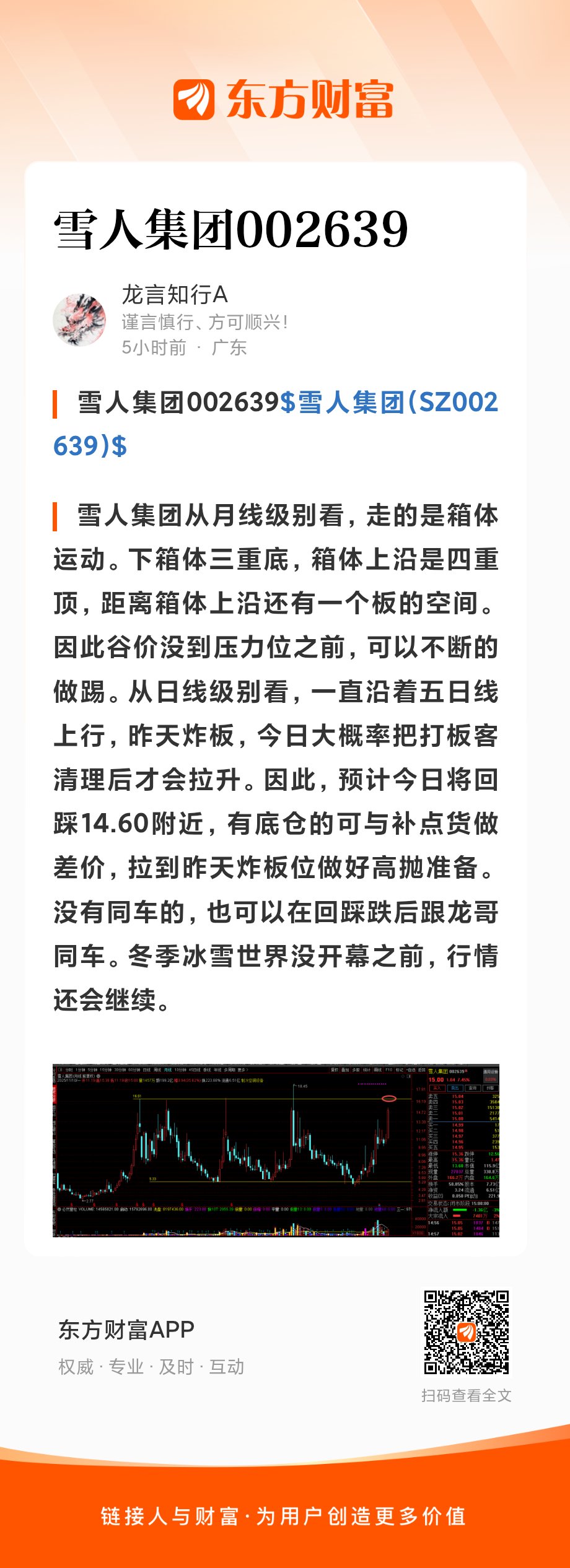 雪人集团从月线级别看,走的是箱体运动。下箱体三重底,箱体上沿是四重顶,距离箱体上沿还有一个板的空间。因此谷价没到压力位之前,可以不断的做踢。从日线级别看,一直沿着五日线上行,昨天炸板,今日大概率把打板客清理后才会拉升。因此,预计今日将回踩14.60附近,有底仓的可与补点货做差价,拉到昨天炸板位做好高抛准备。没有同车的,也可以在回踩跌后跟龙哥同车。冬季冰雪世界没开幕之前,行情还会继续。