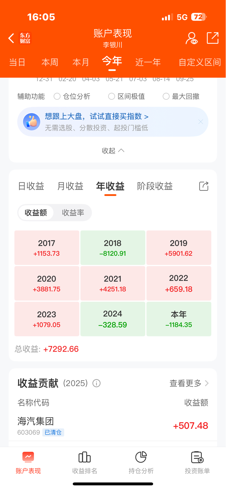 在牛市里面亏损,2023年股市一直下行还赚了些,2024垃圾行情也没亏多少,反而