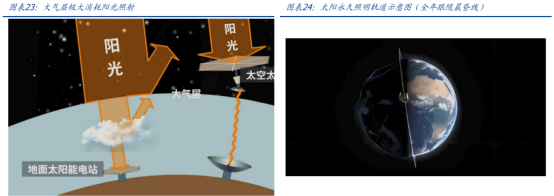 发电效率提升:地球大气层对阳光有削弱,对阳光产生散射与吸收,部分太阳能将损失反射到太空中。而在太空中光子活力更强,且没有大气层反射,发电效率大幅提升。根据中国科学技术馆数据,太空中同面积电池板接受的光能相比地球表面某些地区高出2-3倍。