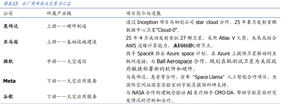 其他运营:SpaceX的Starcloud旨在打造轨道数据中心,通过在太空部署数据中心节点,为地面用户提供边缘计算服务;大型云厂商通过ground-station as a service与spaceto-cloud产品,承担数据落地、存储与二次处理的角色(如Azure Orbital、AWS Ground Station等)。