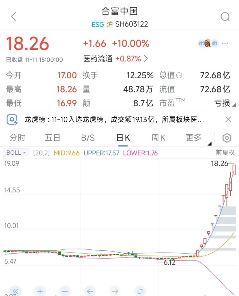 合富中国仅仅用了11个交易日就涨了173.35,涨到了现在的18.26元,是现在A股市场总龙头股。