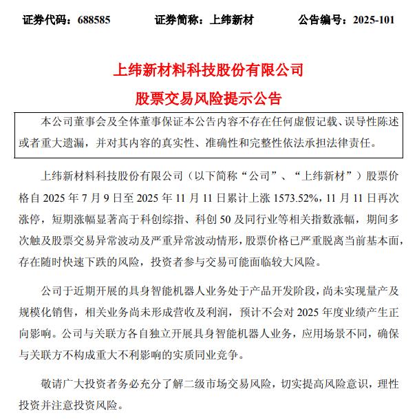 上纬新材11月11日公告,公司主营业务仍为环保高性能耐腐蚀材料、风电叶片用材料、新型复合材料以及循环经济材料的研发、生产及销售,未发生重大变化。公司生产经营未发生重大变化,市场环境或行业政策未发生重大调整,生产成本和销售等情况未出现重大变化。