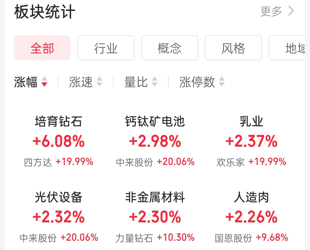 在板块方面,昨日培育钻石、钙钛矿电池、乳业、光伏设备、非金属材料、人造肉等几个板块表现得比较积极,涨幅居前。近几日板块轮动依旧很快,板块持续差,活跃板块大都是一日游。近期板块涨幅也不是很大,板块涨幅与九月时差距较大,市场依旧谨慎今日煤炭板块可能会有所表现。