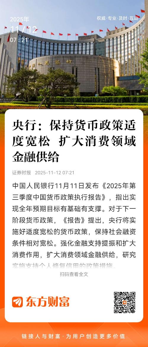 中国人民银行11月11日发布《2025年第三季度中国货币政策执行报告》(以下简称《报告》),指出实现全年预期目标有基础有支撑。对于下一阶段货币政策,《报告》提出,央行将实施好适度宽松的货币政策,保持社会融资条件相对宽松。强化金融支持提振和扩大消费作用,扩大消费领域金融供给,研究实施支持个人修复信用的政策措施。