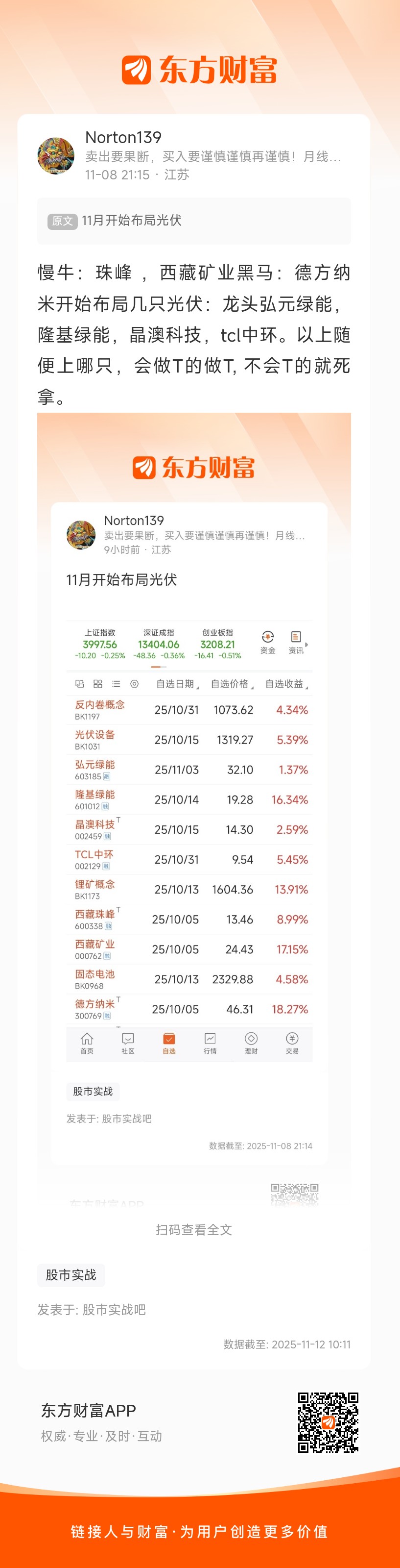 光伏几只已进的不要动,今天应该买,拿起铲子抄!//@Norton139 :慢牛:珠峰,西藏矿业黑马:德方纳米开始布局几只光伏:龙头弘元绿能,隆基绿能,晶澳科技,tcl中环。以上随便上哪只,会做T的做T,不会T的就死拿。