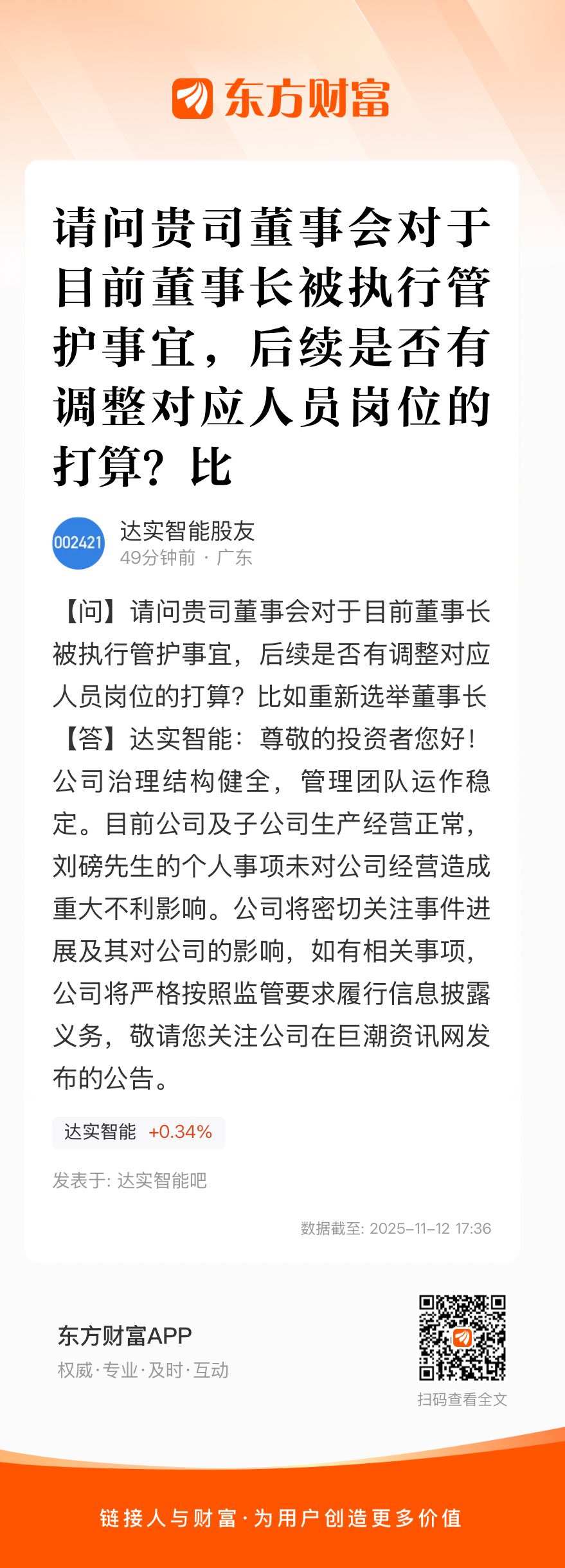 请问贵司董事会对于目前董事长被执行管护事宜,后续是否有调整对应人员岗位的打算?比如重新选举董事长