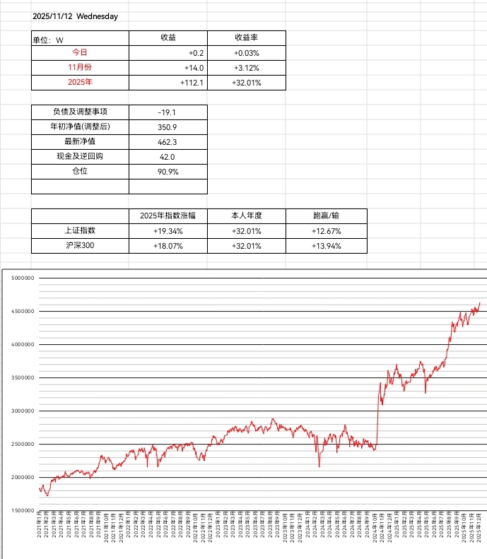 2025.11.12周三今天+0.2w(+0.03%)2025年+112.1w(