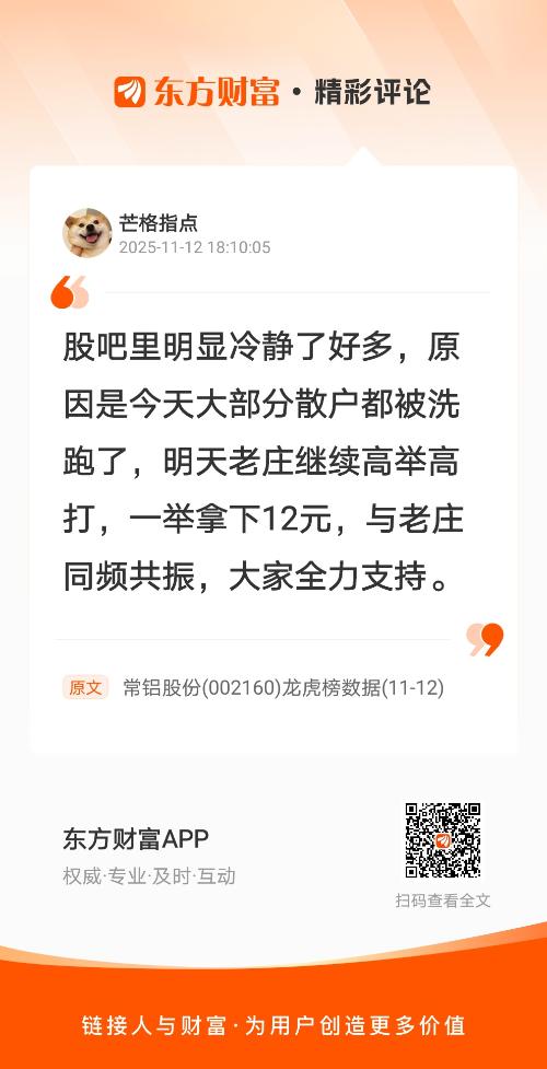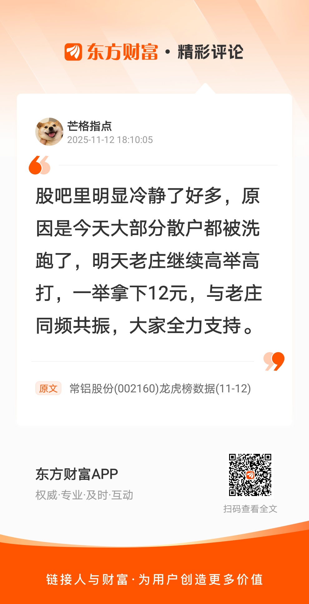 股吧里明显冷静了好多,原因是今天大部分散户都被洗跑了,明天老庄继续高举高打,一举拿下12元,与老庄同频共振,大家全力支持。 我在《常铝股份(002160)龙虎榜数据(11-12)》的评论获得了大家的关注。