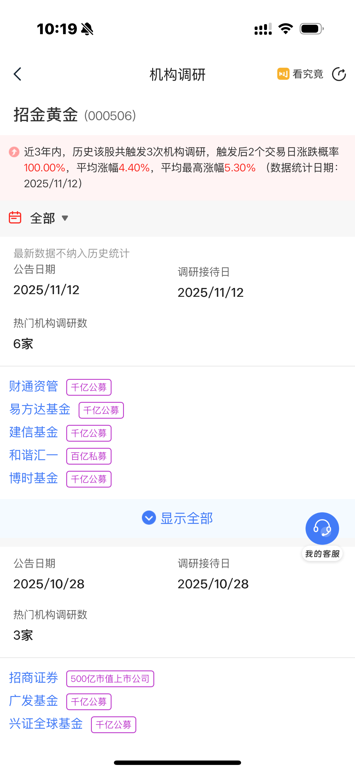 招金黄金昨天接受易方达基金,建信基金等机构进行调研,这票历史接受调研后,2个交易