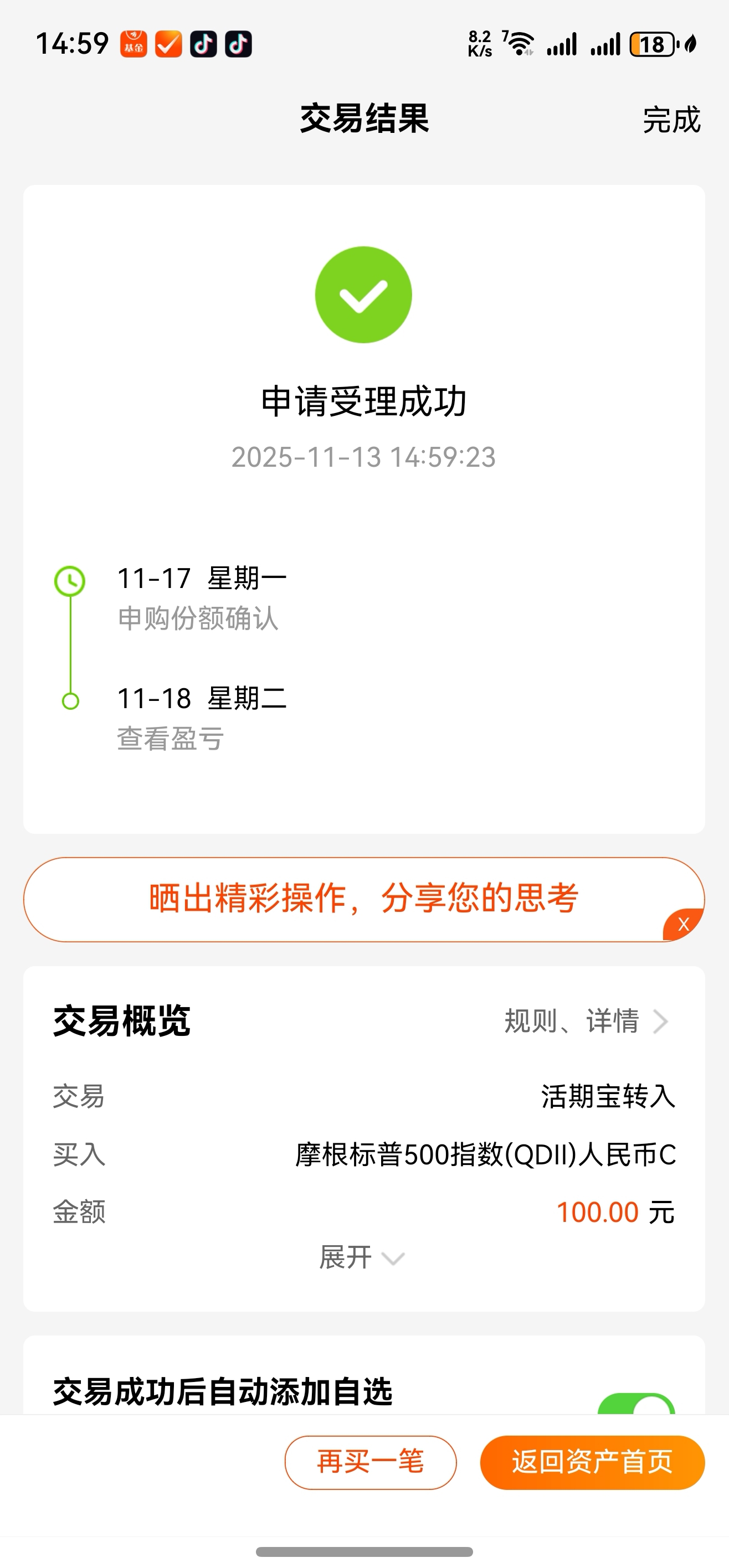 反正观察这个摩根标普500指数qdll基金,在每天就只能选择100元的这一点点点资金而已。