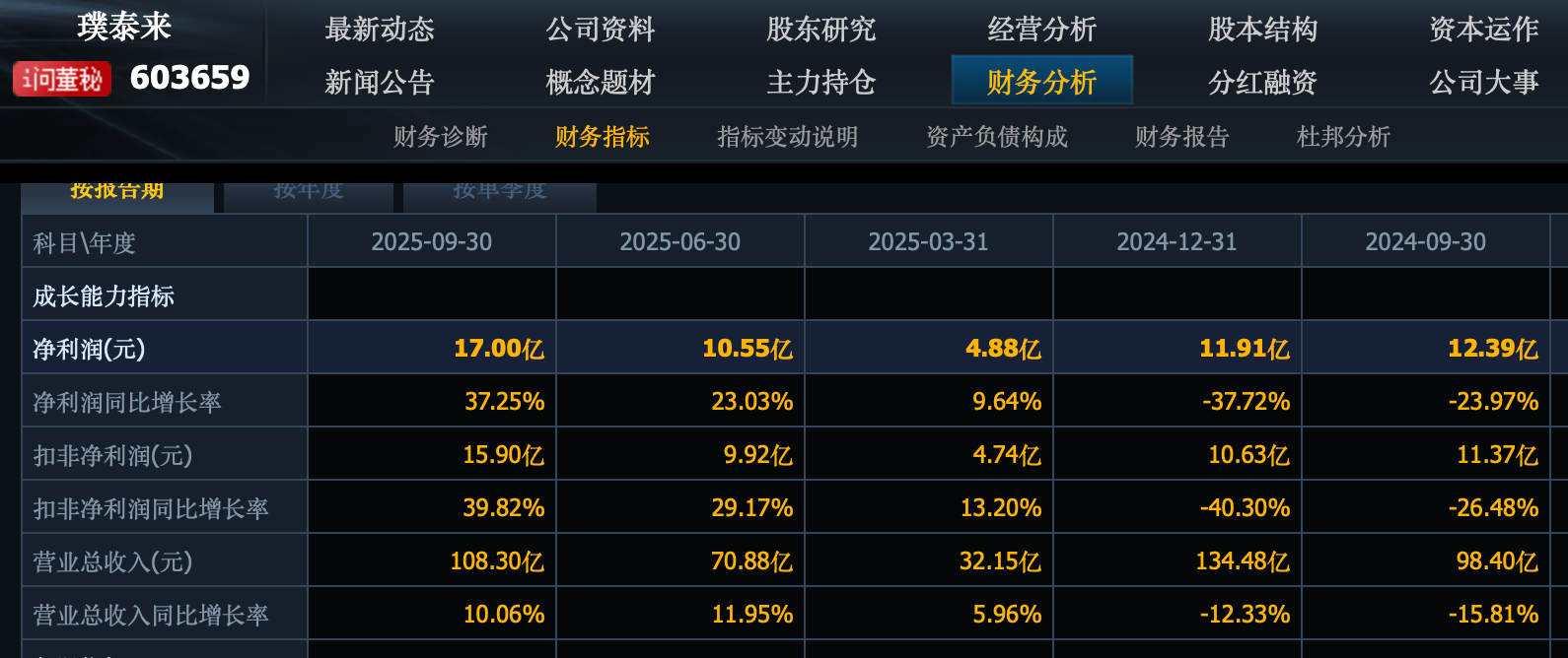 璞泰来今年前三季度收入增长10%达到108亿元,净利润增长37%达到17亿元。