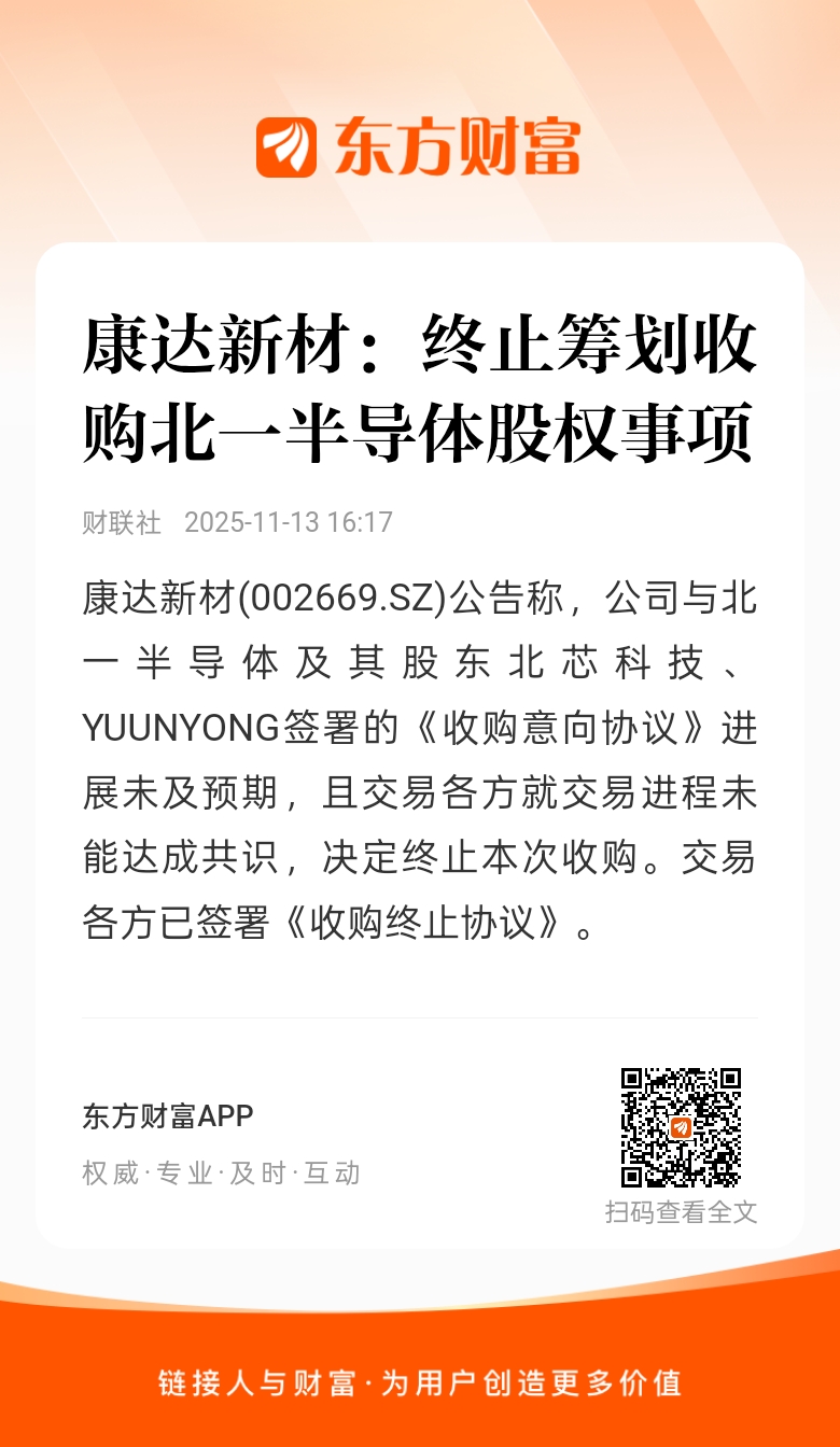 康达新材(002669.SZ)公告称,公司与北一半导体及其股东北芯科技、YUUNYONG签署的《收购意向协议》进展未及预期,且交易各方就交易进程未能达成共识,决定终止本次收购。交易各方已签署《收购终止协议》。该协议仅为意向性约定,终止不存在违约行为及争议和纠纷。终止收购不会对公司产生重大不利影响,公司将继续围绕战略目标开展经营管理工作。