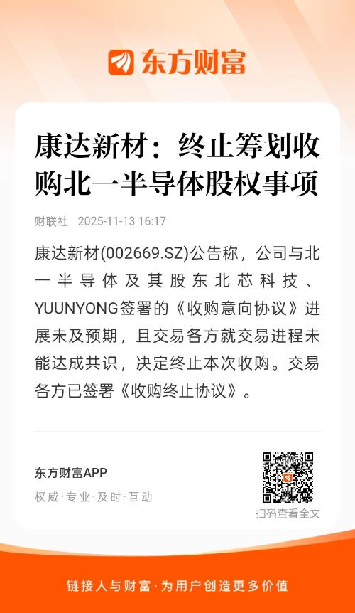 康达新材:终止筹划收购北一半导体股权事项财联社9分钟前约46秒K图 002669_0康达新材(002669.SZ)公告称,公司与北一半导体及其股东北芯科技、YUUNYONG签署的《收购意向协议》进展未及预期,且交易各方就交易进程未能达成共识,决定终止本次收购。交易各方已签署《收购终止协议》。该协议仅为意向性约定,终止不存在违约行为及争议和纠纷。终止收购不会对公司产生重大不利影响,公司将继续围绕战略目标开展经营管理工作。分享至:微信朋友圈微博郑重声明:东方财富发布此内容旨在传播更多信息,与本站立场无关,不构成投资建议。据此操作,风险自担。