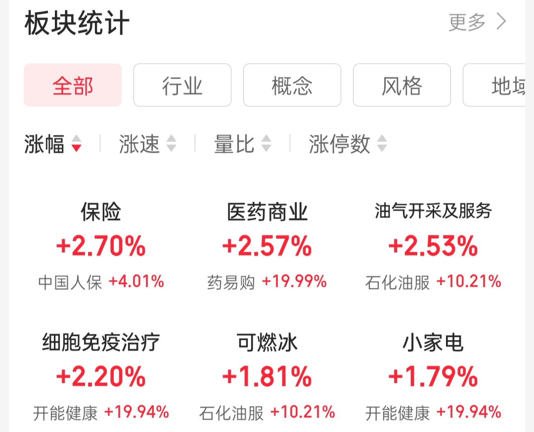 在板块方面,昨日保险、医药商业、油气开采、细胞免疫治疗、可燃冰、小家电等几个板块表现得相对活跃,涨幅排名靠前。这几日板块轮动都较快、持续差,活跃板块大都是一日游。近期板块涨幅也不是很大,板块涨幅与九月时差距较大。市场显得较为谨慎,注意节凑把握,见好就收。