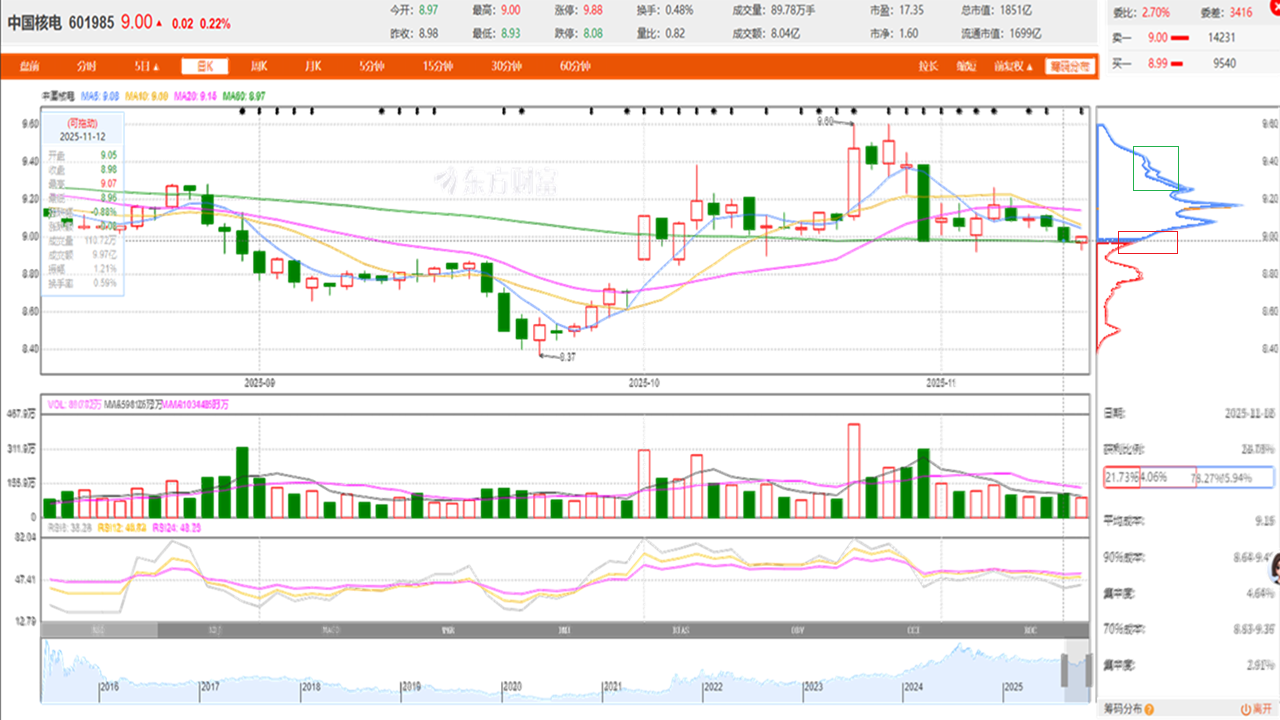 中国核电今天9.4价位左右(盈亏-5%)出货,8.95-9.00价位扫货。