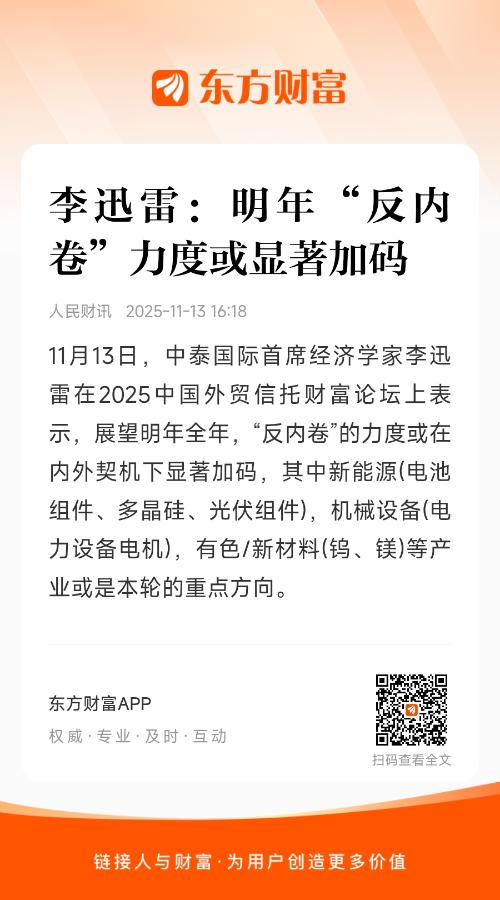 11月13日,中泰国际首席经济学家李迅雷在2025中国外贸信托财富论坛上表示,展望明年全年,“反内卷”的力度或在内外契机下显著加码,其中新能源(电池组件、多晶硅、光伏组件),机械设备(电力设备电机),有色/新材料(钨、镁)等产业或是本轮的重点方向。