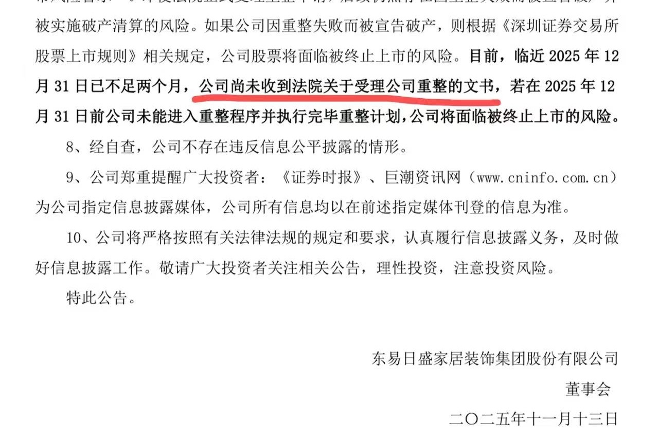 月 31 日已不足两个月,公司尚未收到法院关于受理公司重整的文书,若在 2025 年 12