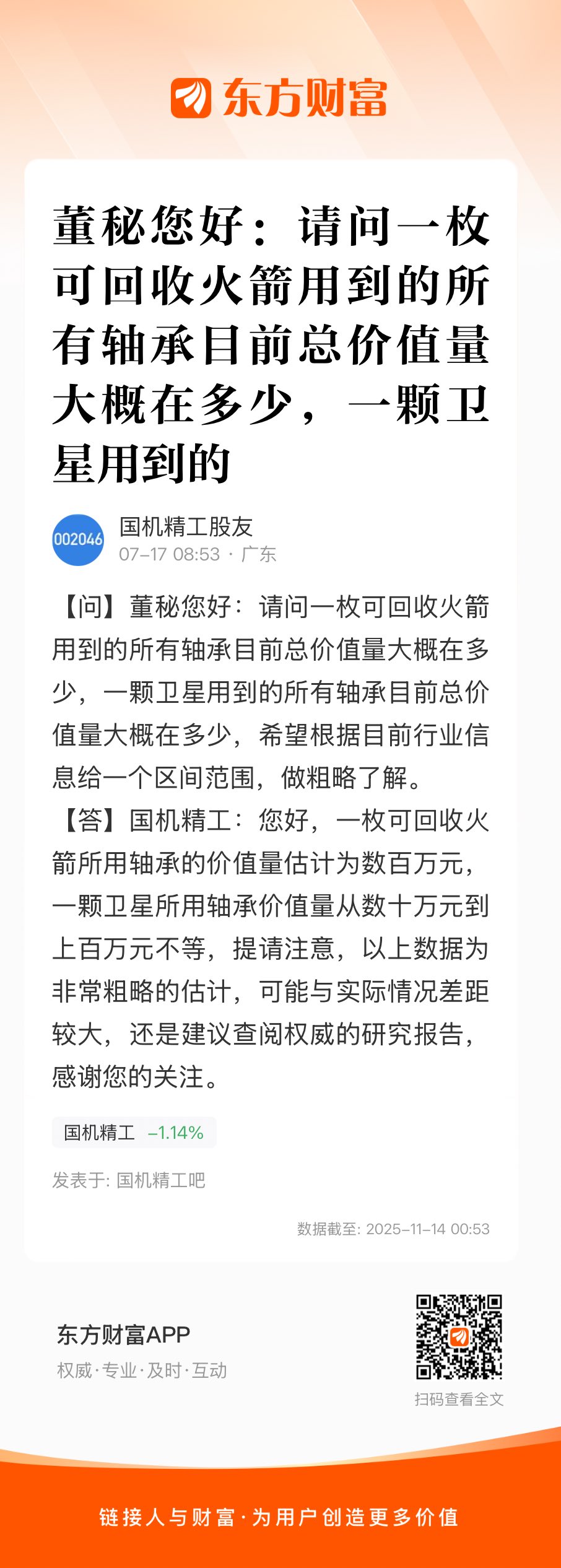 董秘您好:请问一枚可回收火箭用到的所有轴承目前总价值量大概在多少,一颗卫星用到的所有轴承目前总价值量大概在多少,希望根据目前行业信息给一个区间范围,做粗略了解。