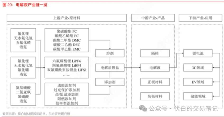 电解液主要作为锂离子传输介质,当电池充放电时,锂离子通过电解液在正负极之间迁移;其组成包括: