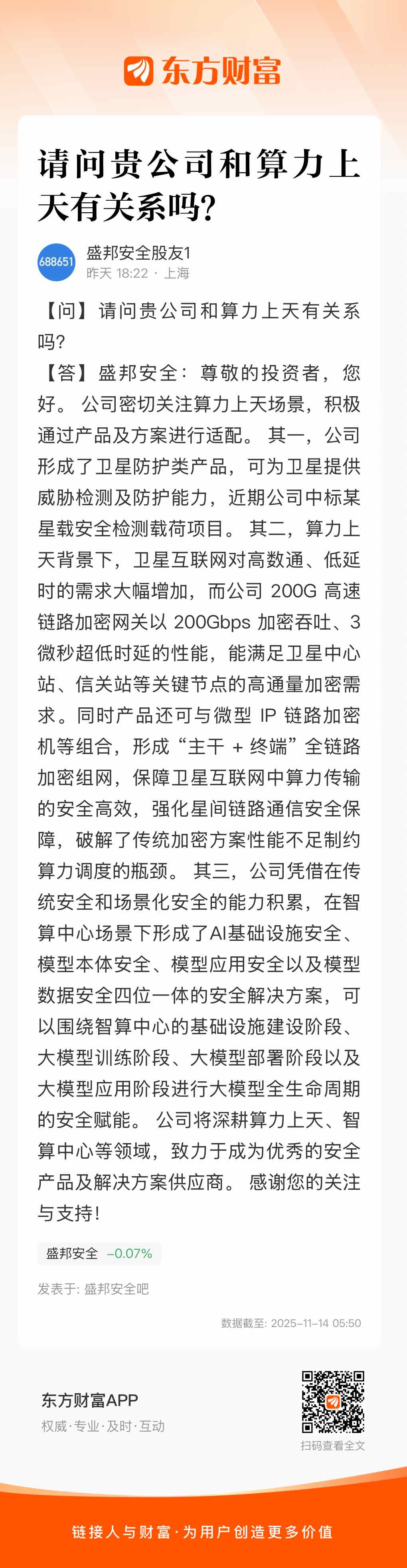 尊敬的投资者,您好。 公司密切关注算力上天场景,积极通过产品及方案进行适配。 其一,公司形成了卫星防护类产品,可为卫星提供威胁检测及防护能力,近期公司中标某星载安全检测载荷项目。 其二,算力上天背景下,卫星互联网对高数通、低延时的需求大幅增加,而公司 200G 高速链路加密网关以 200Gbps 加密吞吐、3 微秒超低时延的性能,能满足卫星中心站、信关站等关键节点的高通量加密需求。同时产品还可与微型 IP 链路加密机等组合,形成 “主干 + 终端” 全链路加密组网,保障卫星互联网中算力传输的安全高效,强化星间链路通信安全保障,破解了传统加密方案性能不足制约算力调度的瓶颈。 其三,公司凭借在传统安全和场景化安全的能力积累,在智算中心场景下形成了AI基础设施安全、模型本体安全、模型应用安全以及模型数据安全四位一体的安全解决方案,可以围绕智算中心的基础设施建设阶段、大模型训练阶段、大模型部署阶段以及大模型应用阶段进行大模型全生命周期的安全赋能。 公司将深耕算力上天、智算中心等领域,致力于成为优秀的安全产品及解决方案供应商。 感谢您的关注与支持!