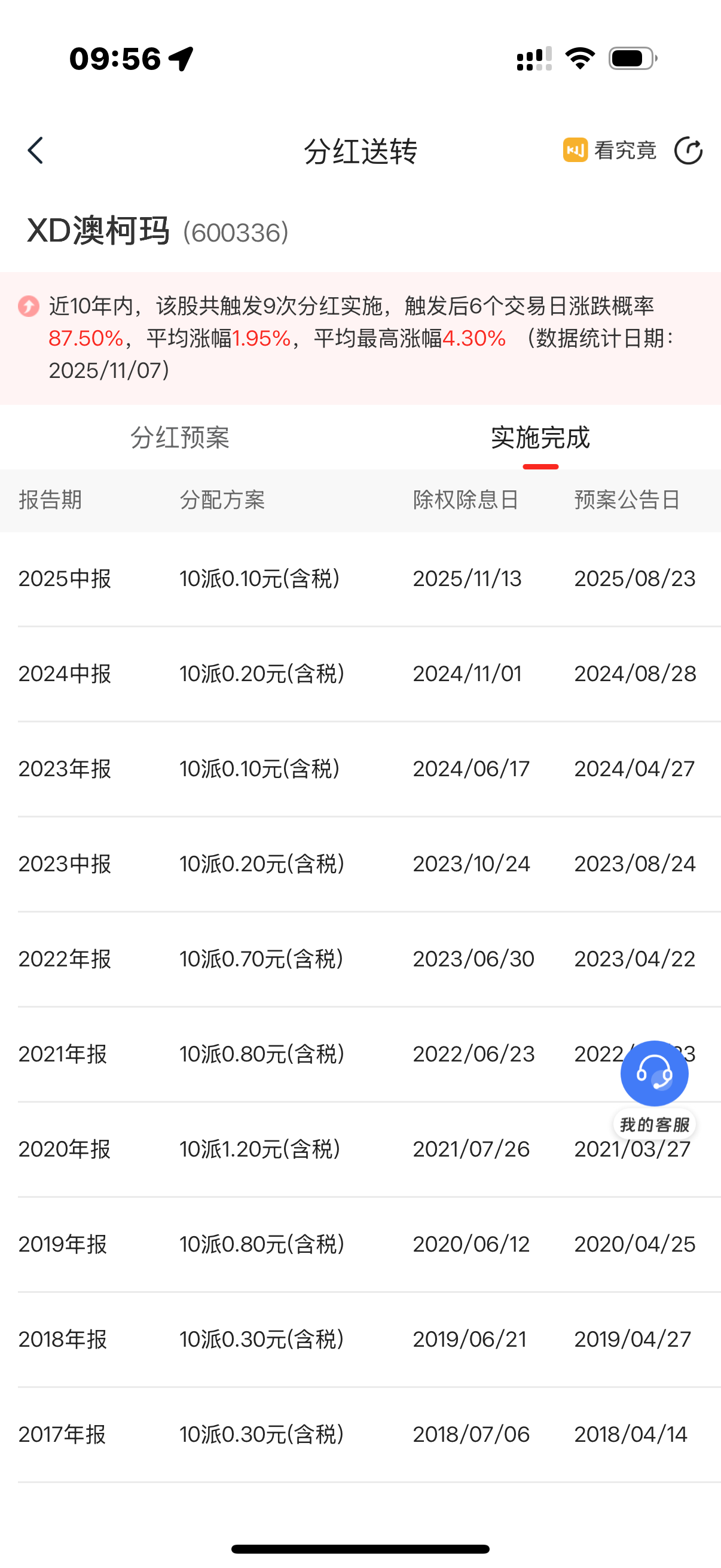 澳柯玛今日完成分红,以10股派发0.1元的方案,这票这几年的分红都很稳定,也连带
