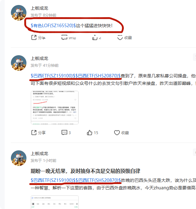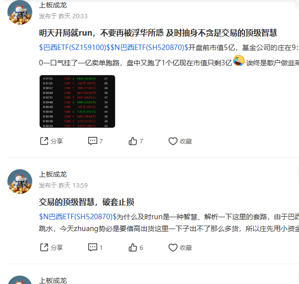 小心庄托股托,这两天有托一直在股吧里十分卖力的长篇大论的唱空巴西ETF,他叫人卖出巴西ETF然后把人骗到已经大涨过的有色LOF等一些成交量流动性很差的票去给他高位接盘。$巴西ETF(SH520870)$ $巴西ETF(SZ159100)$