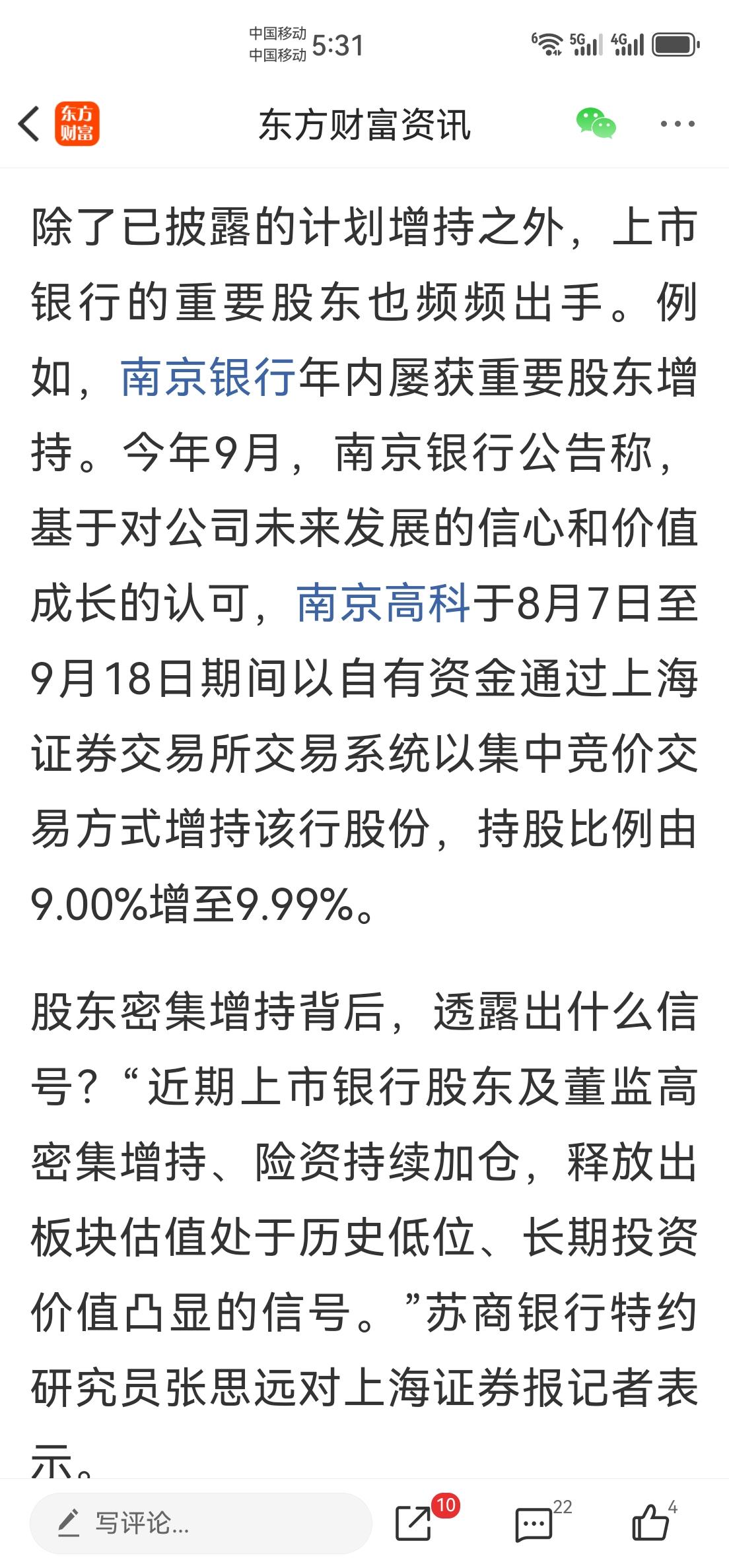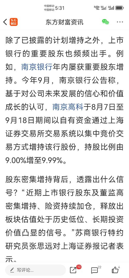 除了已披露的计划增持之外,上市银行的重要股东也频频出手。例如,南京银行年内屡获重要股东增持。今年9月,南京银行公告称,基于对公司未来发展的信心和价值成长的认可,南京高科于8月7日至9月18日期间以自有资金通过上海证券交易所交易系统以集中竞价交易方式增持该行股份,持股比例由9.00%增至9.99%。