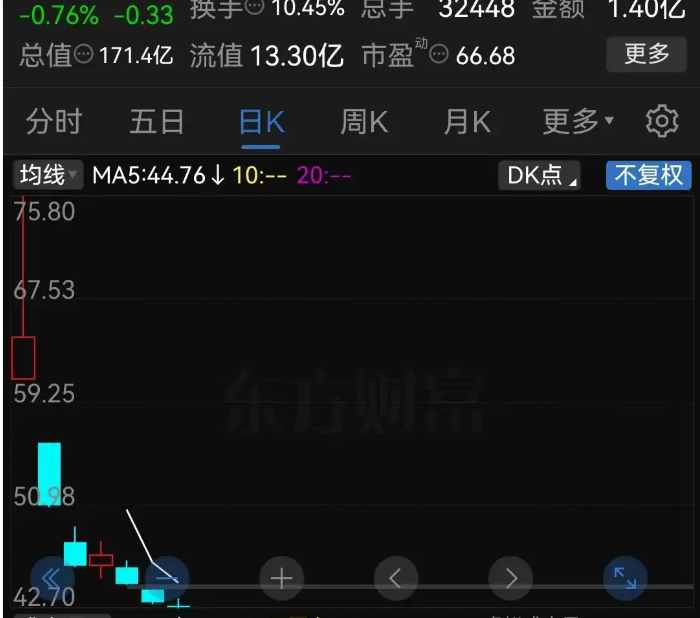 还敢买新股吗?就问你这走势惨不惨?上市7天股价崩盘式下跌,从最高75.80元跌到了今天最低42.70元,跌幅高达44%,都快腰斩了。