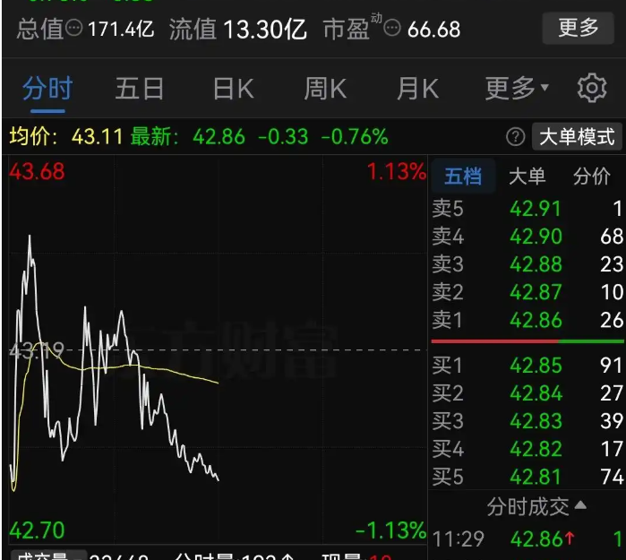 上市第二天,大明电子跳空低开低走,收盘股价报收于50.96元,大跌20.93%,上市第三天再次大跌9.5%,此后又连跌几天,今天是大明电子上市的第七天,截至上午收盘股价报收于42.86元,而盘中最低跌到了42.70元,再次创出了上市以来的新低。