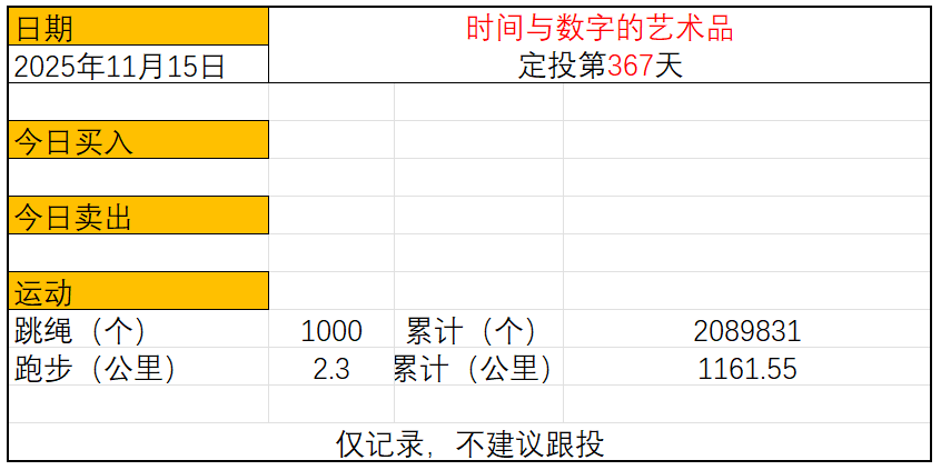 运动与投资第367天2025年11月15日今日定投:周末,没有定投跳绳:1000