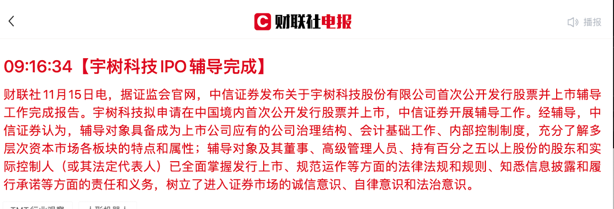 刚刚市场公布了,宇树科技IPO辅导完成的消息,这意味着宇树科技上市箭在弦上了,按照这个节奏明年一季度宇树科技要登陆A股了。
