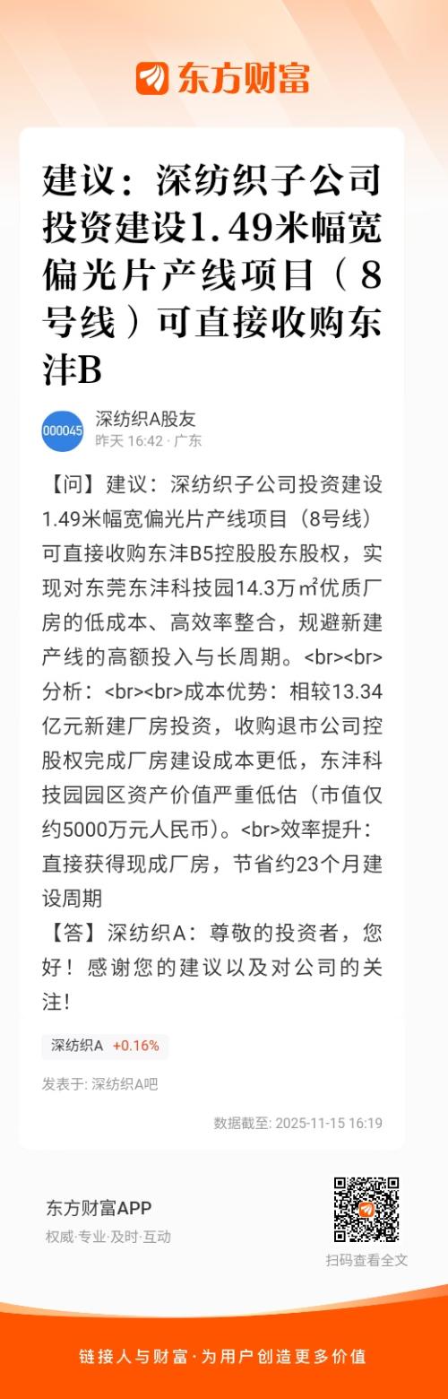 建议:深纺织子公司投资建设1.49米幅宽偏光片产线项目(8号线)可直接收购东沣B5控股股东股权,实现对东莞东沣科技园14.3万㎡优质厂房的低成本、高效率整合,规避新建产线的高额投入与长周期。