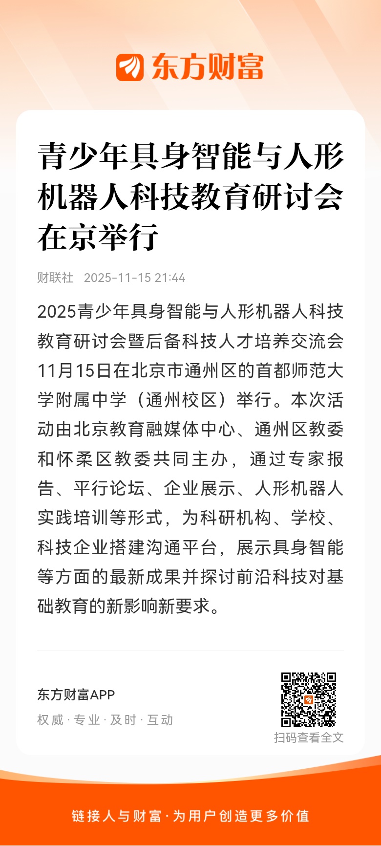 2025青少年具身智能与人形机器人科技教育研讨会暨后备科技人才培养交流会11月15日在北京市通州区的首都师范大学附属中学(通州校区)举行。本次活动由北京教育融媒体中心、通州区教委和怀柔区教委共同主办,通过专家报告、平行论坛、企业展示、人形机器人实践培训等形式,为科研机构、学校、科技企业搭建沟通平台,展示具身智能等方面的最新成果并探讨前沿科技对基础教育的新影响新要求。