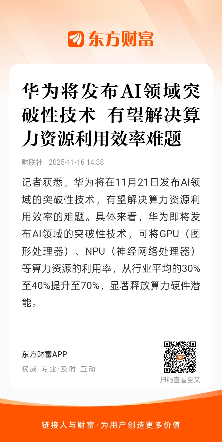 华为将发布AI领域突破性技术 有望解决算力资源利用效率难题财联社5小时前约58秒记者获悉,华为将在11月21日发布AI领域的突破性技术,有望解决算力资源利用效率的难题。具体来看,华为即将发布AI领域的突破性技术,可将GPU(图形处理器)、NPU(神经网络处理器)等算力资源的利用率,从行业平均的30%至40%提升至70%,显著释放算力硬件潜能。据透露,华为即将发布AI领域的突破性技术,是通过软件创新实现英伟达、昇腾及其他三方算力的统一资源管理与利用,屏蔽算力硬件差异,为AI训练推理提供更高效的资源支撑。分享至:微信朋友圈微博郑重声明:东方财富发布此内容旨在传播更多信息,与本站立场无关,不构成投资建议。据此操作,风险自担。