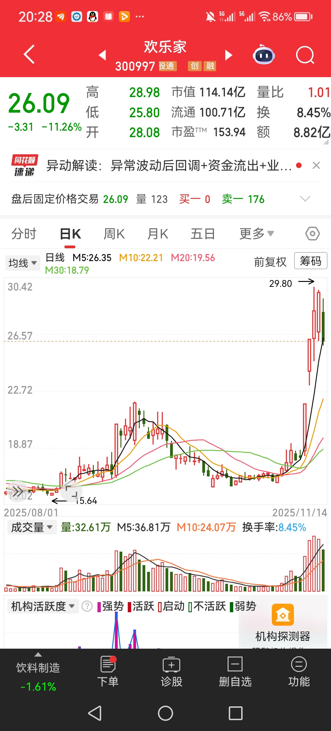 最近实盘在17.95元购入欢乐家,上周三最高涨到29.8元,29.8/17.95