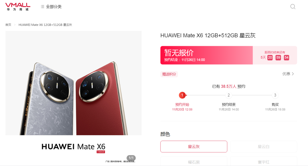 今天12:08,全新折叠旗舰华为Mate X6开启预订,也将在11月26日华为Mate品牌盛典正式发布。