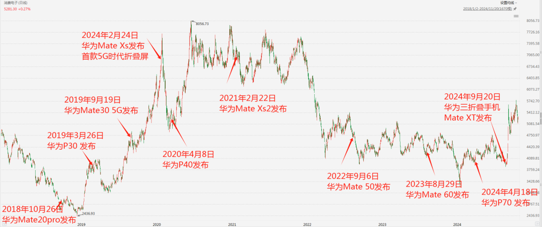 下面也盘点了2018年以来华为重量级新机发布后消费电子板块的走势。