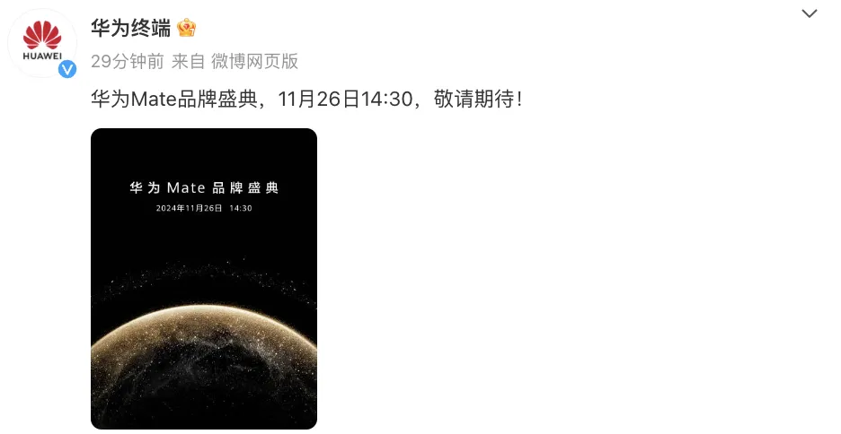 11月18日,华为终端官方发布微博称华为Mate品牌盛典将在11月26日14:30举行。