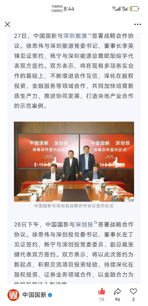 徐思伟介绍了中国国新作为国有资本运营公司的功能定位和业务格局。他表示,深圳能源产业布局全国、走向海外,在能源保障、城市服务、海外项目开发等方面的特色明显,中国国新以服务国家战略为导向,不断丰富运营功能,构建市场化专业化运作平台,与深圳能源具有深厚的合作基础,未来合作前景广阔。希望以本次签署协议为新起点,围绕各自优势领域进一步加强协同合作,实现资源整合、优势互补,携手开创共赢发展新局面。
