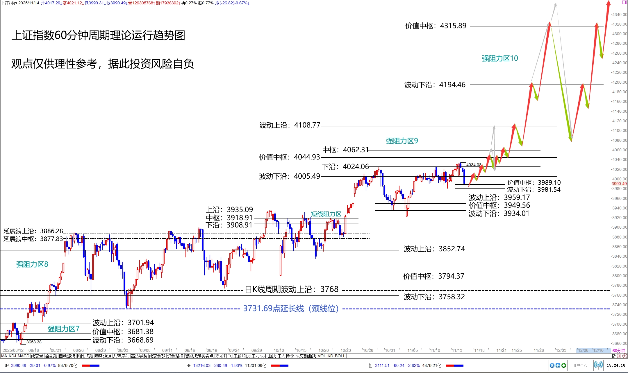 下图是我在《上周五收评》中为大家预测并绘制的《上证指数60分钟周期理论运行趋势图》
