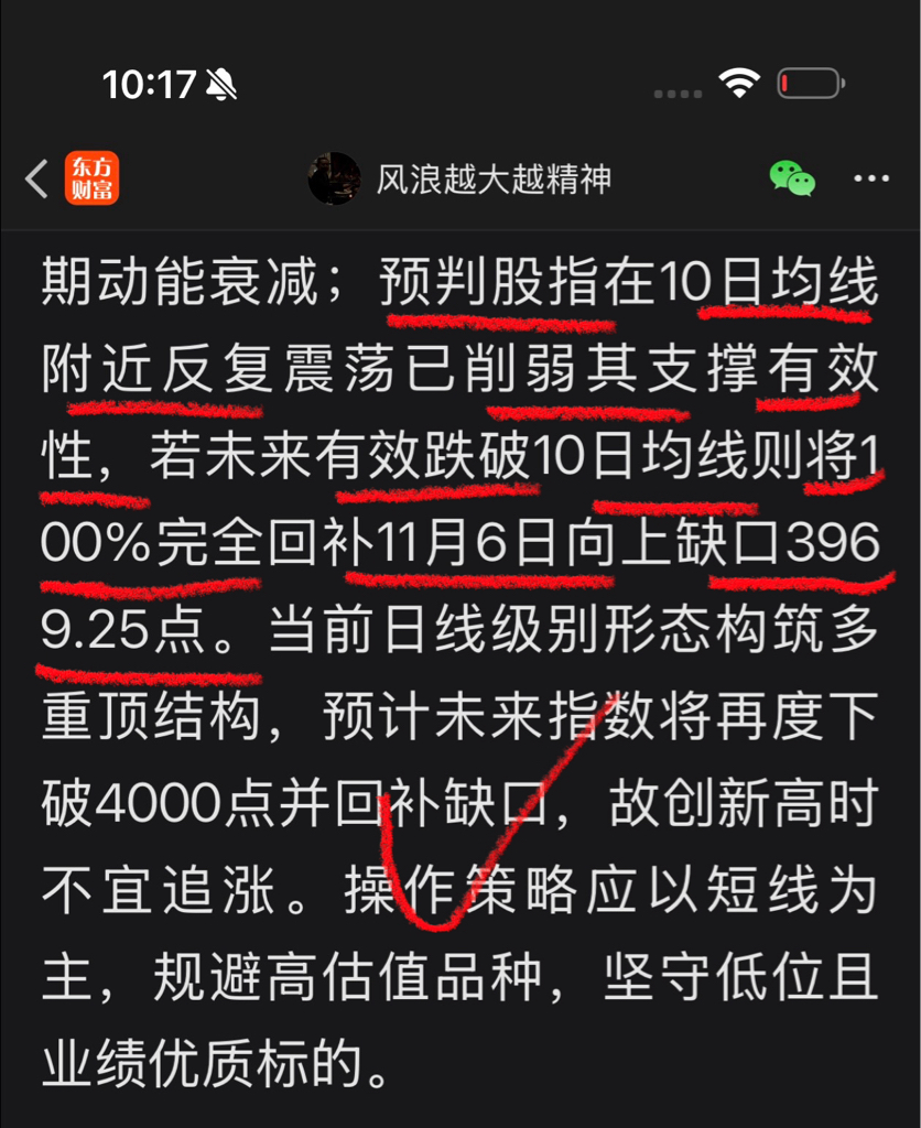 上周五曾连续提示认为:预判股指在10日均线附近反复震荡已削弱其支撑有效性,若未来有效跌破10日均线则将100%完全回补11月6日向上缺口3969.25点。今天上午大盘已经100%回补了此缺口,就此来看,完全符合预期。